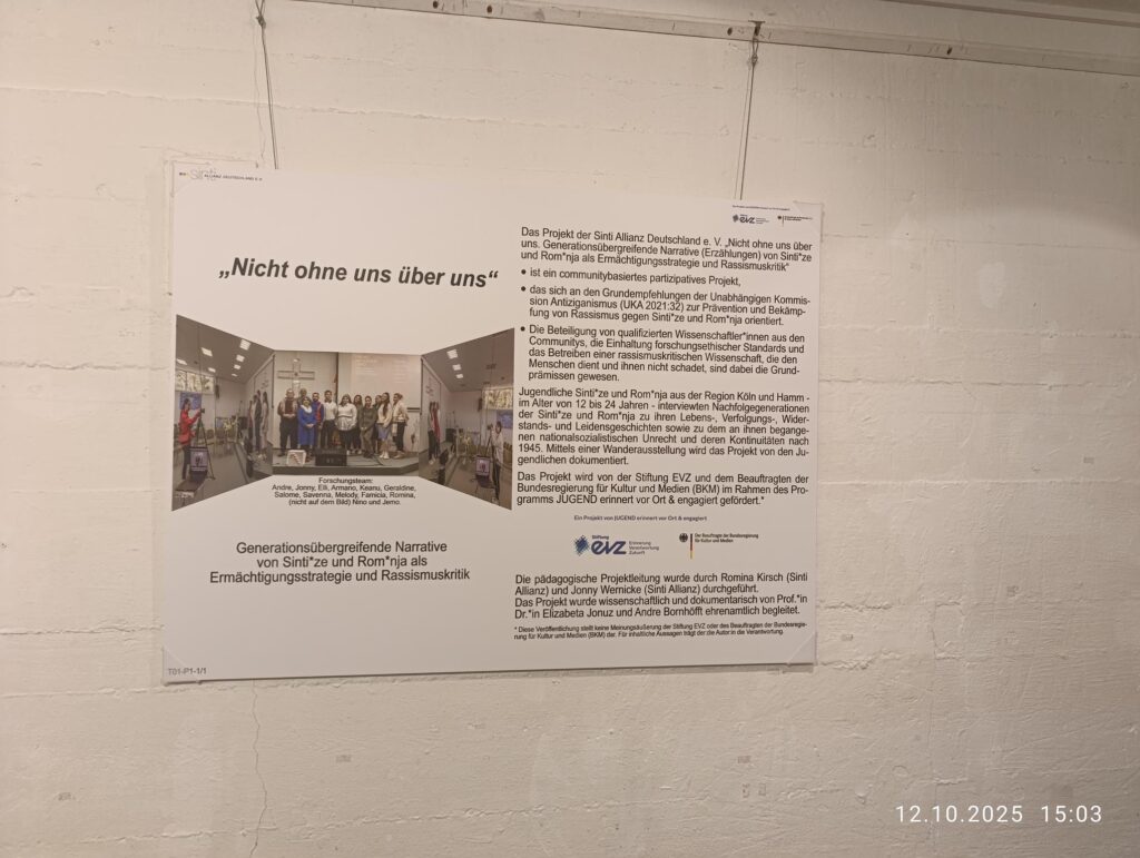 Im Oktober 2024 startete unser einjähriges Projekt „Nicht ohne uns über uns – Generationsübergreifende Narrative von Sinti und Roma“, das Jugendliche aus Köln und Hamm einlädt, sich mit der Geschichte ihrer Familien auseinanderzusetzen und ihre Stimmen sichtbar zu machen.