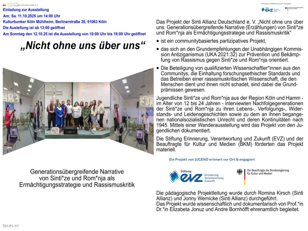Die Ausstellung „Nicht ohne uns über uns“ zeigt eindrucksvoll, wie wichtig es ist, dass junge Sintize und Romnja selbst ihre Geschichte erzählen, ihre Sichtweisen teilen und sich für ihre Rechte und ihre Zukunft einsetzen. Sie beweist, dass Empowerment dann am stärksten ist, wenn es aus der eigenen Gemeinschaft heraus geschieht.